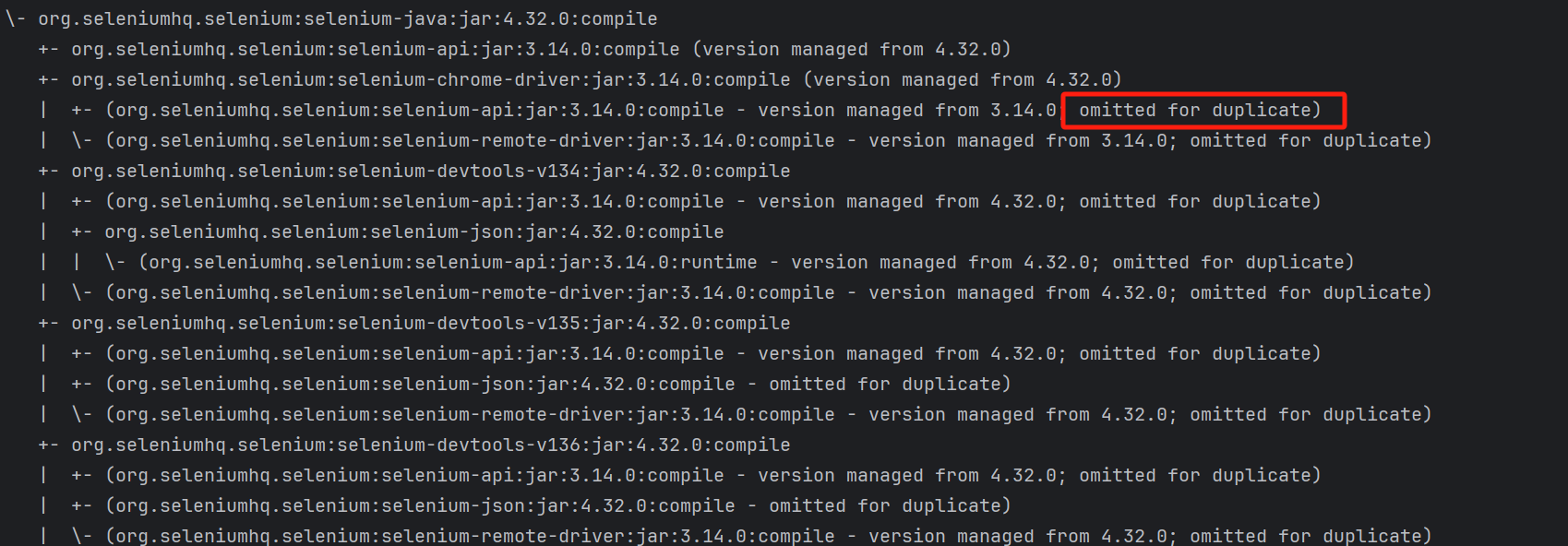 显然selenium-java的4.32版本全部依赖都是显示的声名的4.32版本,这里基本可以确认依赖存在冲突,可以确定存在依赖冲突。但是我们通过Idea依赖树看,没有omitted for duplicate 提示,这就有点坑了。