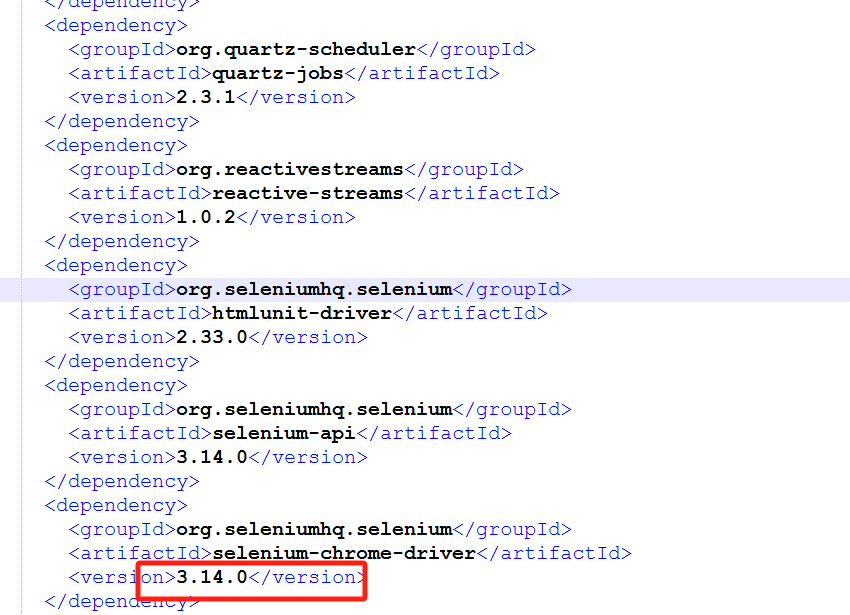 既然知道了问题所在,直接升级springboot或者显示的指定selenium-java依赖的版本即可,如下所示: