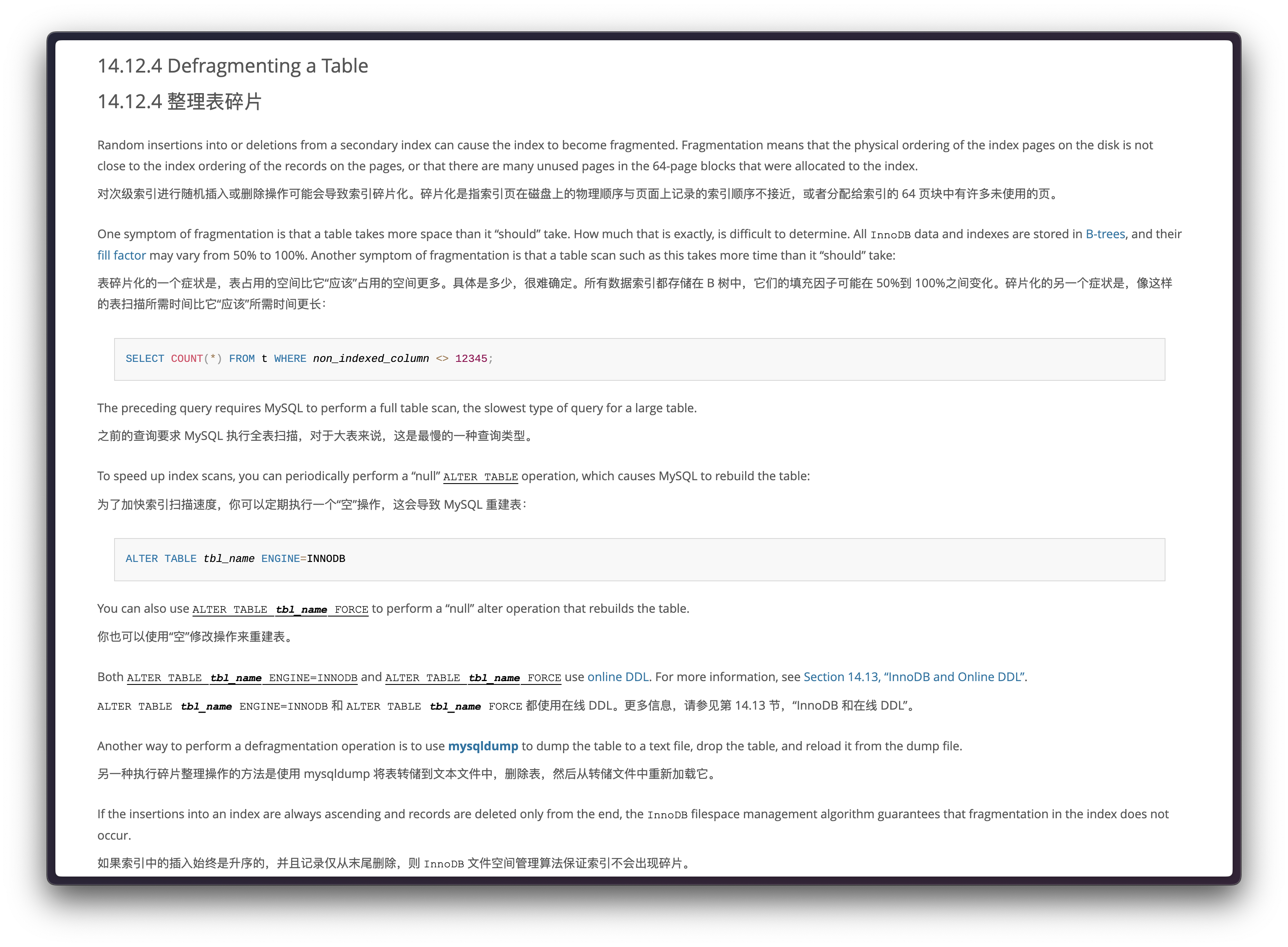 查阅 MySQL 官方文档-Defragmenting a Table,发现可以使用如下语句整理碎片: