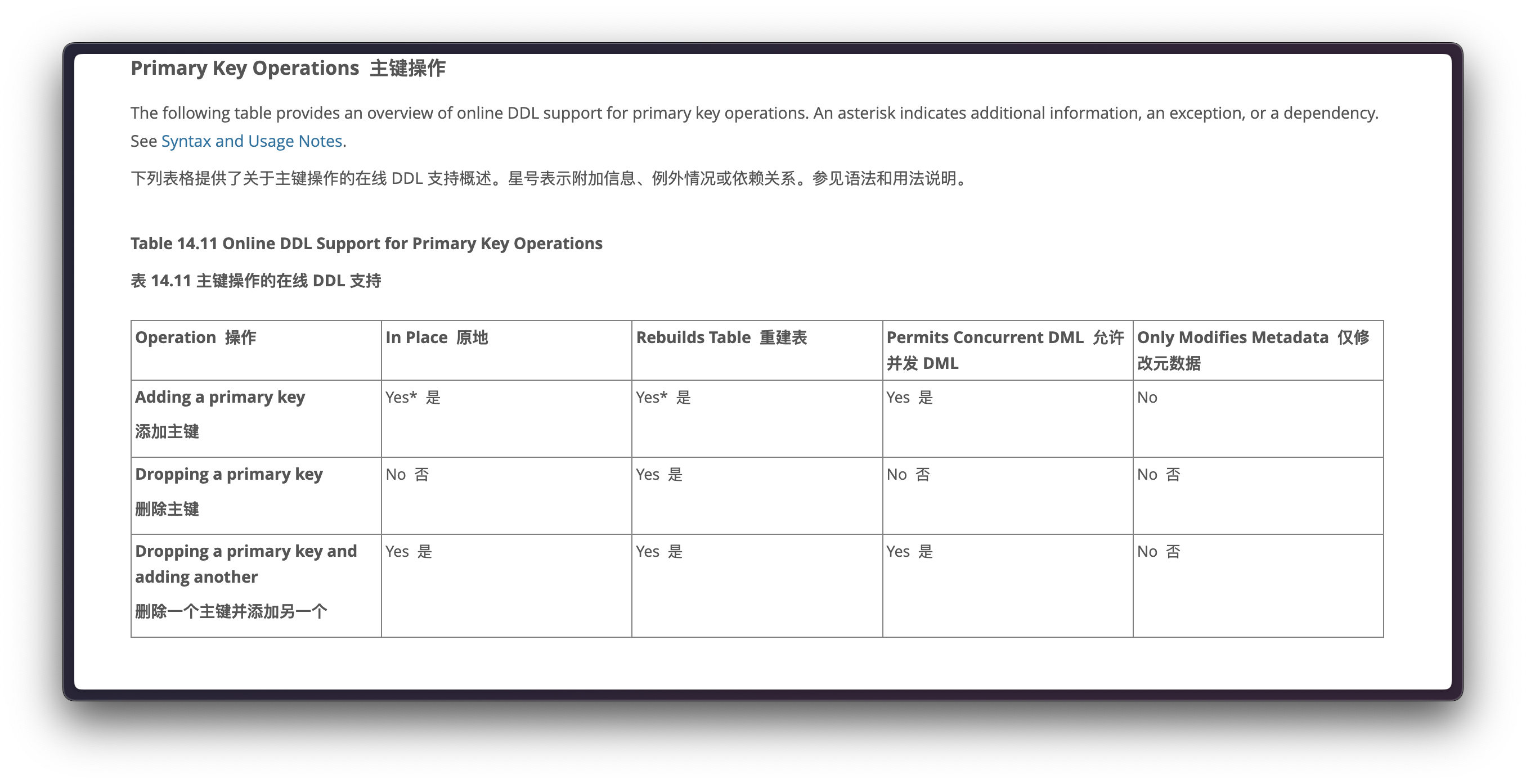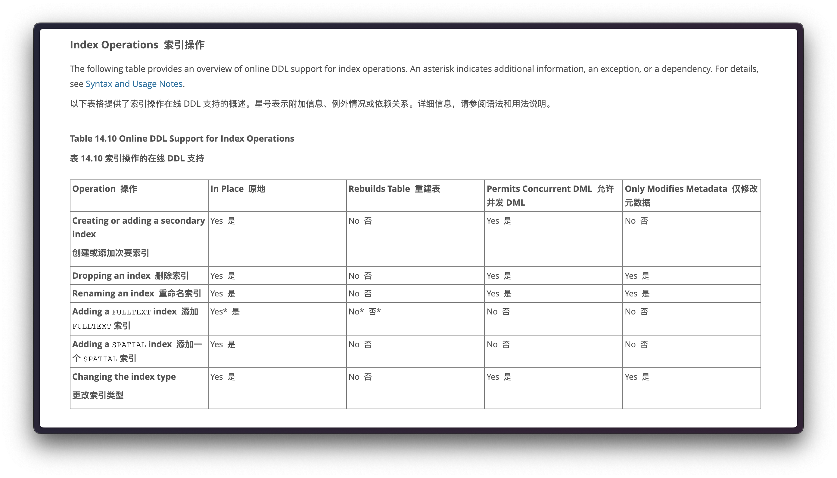在 Online DDL 过程中哪些操作可以触发重建表,哪些操作是"原地"或称"就地"操作,官方给出了详细说明,这里罗列一些开发中常见的一些操作: