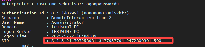 加载mimikatz抓取win7账号密码,sid。发现是system权限直接修改本机管理员的密码,打开3389端口登录本机管理员。