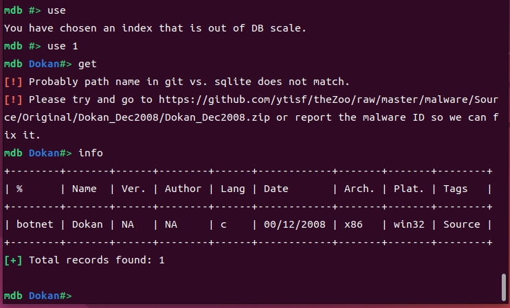 use命令选中其中一个病毒(恶意软件)样本进行下载、查看信息