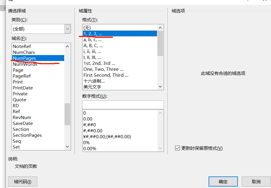 4、光标放在"共 页"之间并插入NumPages(表示文档总页数),执行与上一步同样的操作,不过域名选择"NumPages";