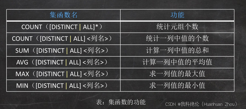 Modify \<列名\>\<数据类型\>\]); 如: ALTER TABLE S ADD Zap CHAR(6); //在表S中新增一列ZAP,该列的数据为空 ALTER TABLE S MODIFY Status INT; //将表S的Status属性的数据类型更改为INT ALTER TABLE S ADD Constraint C_cno CHECK(...) //在表S中新增CHECK约束,取名为C_cno 3、删除表 语句格式:DROP TABLE \<表名\> 如: DROP TABLE S; //表删除后,不再是数据库模式的一部分 **索引的创建和删除** 1、索引的概念 • 数据库中的索引与书籍中的索引类似,在一本书中,利用索引可以快速查找到所需信息,无须阅 读整本书。在数据库中,索引使数据库无须对整个表进行扫描,就可以在其中找到所需数据。 • 比如在字典中,我们按字母建立索引。在数据库中,索引是某个表中的一列或者若干列的值的集 合,和相应的指向表中物理标识这些值的数据页的逻辑指针清单。 2、索引的作用 (1)通过创建唯一索引,可以保证数据记录的唯一性。 (2)可以大大加快数据检索速度。 (3)可以加速表与表之间的连接,这一点在实现数据的参照完整性方面有特别的意义。 (4)在使用ORDER BY和GROUP BY子句中进行检索数据时,可以显著减少查询中分组和排序的时间。 (5)使用索引可以在检索数据的过程中使用优化隐藏器,提高系统性能。 索引分为聚集索引和非聚集索引。聚集索引是指索引表中索引项的顺序与表中记录的物理顺序 一致的索引。 3、建立索引: 语句格式:CREATE \[UNIQUE\]\[CLUSTER\] INDEX \<索引名\> ON \<表名\>(\<列名\>\[\<次序\>\]\[,\<列名\>\[\<次序\>\]\]...); • 次序:ASC(升序)或DESC(降序),默认为升序。 • UNIQUE:表明此索引的每一个索引值只对应唯一的数据记录。 • CLUSTER:表明要建立的索引是聚簇索引,意为索引项的顺序是与表中记录的物理顺序一致的索引组织 如: CREATE UNIQUE INDEX S_Sno on S(Sno); //在表S的Sno列上建立索引S_Sno,默认为升序 CREATE UNIQUE INDEX P_Pno on P(Pno); //在表P的Pno列上建立索引P_Pno,默认为升序 CREATE UNIQUE INDEX J_Jno on J(Jno); //在表J的Jno列上建立索引J_Jno,默认为升序 CREATE UNIQUE INDEX SPJ_NO on SPJ(Sno ASC,Pno DESC,Jno ASC); //在表SPJ上建立索引SPJ_NO,属性Sno按升序,Pno按降序,Jno按升序 4、删除索引 语句格式:DROP INDEX \<索引名\> 例:DROP INDEX StudentIndex; //删除索引StudentIndex **视图的创建和删除** 1、视图的作用: 视图是从一个或者多个基本表或视图中导出的表,其结构和数据是建立在对表的查询基础上的。和真实的表一样,视图也包括几个被定义的数据列和多个数据行,但从本质上讲,这些数据列和数据行来源于其所引用的表。因此,视图不是真实存在的基本表,而是一个虚拟表,视图所对应的数据并不实际地以视图结构存储在数据库中,而是存储在视图所引用的表中。使用视图的优点和作用如下: (1)可以使视图集中数据、简化和定制不同用户对数据库的不同数据要求。(2)使用视图可以屏蔽数据的复杂性,用户不必了解数据库的结构,就可以方便地使用和管理数据,简化数据权限管理和重新组织数据以便输出到其他应用程序中。 (3)视图可以使用户只关心他感兴趣的某些特定数据和所负责的特定任务,而那些不需要的或者无用的数据则不在视图中显示。 (4)视图大大地简化了用户对数据的操作。 (5)视图可以让不同的用户以不同的方式看到不同或者相同的数据集。 (6)在某些情况下,由于表中数据量太大,因此在表的设计时常将表进行水平或者垂直分割,但表的结构的变化对应用程序产生不良的影响。 (7)视图提供了一个简单而有效的安全机制。 2、创建视图 语句格式:CREATE VIEW 视图名(列表名) AS SELECT 查询子句 \[WITH CHECK OPTION\]; • 视图的创建中,必须遵循如下规定: (1)子查询可以是任意复杂的SELECT语句,但通常不允许含有ORDER BY子句和DISTINCT短语。 (2)WITH CHECK OPTION表示对UPDATE,INSERT,DELETE操作时保证更新、插入或删除的行满足视图 定义中的谓词条件(即子查询中的条件表达式) (3)组成视图的属性列名或者全部省略或者全部指定。如果省略属性列名,则隐含该视图由SELECT 子查询目标列的主属性组成。 例:学生关系模式S(Sno,Sname,Sage,Sex,SD,Email,Tel),建立计算机系(CS表示计算机系)学生的 视图,并要求进行修改、插入操作时保证该视图只有计算机系的学生。 CREATE VIEW CS_STUDENT //创建视图CS_STUDENT AS SELECT Sno,Sname,Sage,Sex //选择学号、姓名、年龄、性别列 FROM Student //从学生表中查询 Where SD='CS' //选择系名等于"CS"的行 WITH CHECK OPTION; //以后对该视图进行修改、插入操作时DBMS 会自动加上SD='CS'的条件, 保证视图中只有计算机系的学生 3、删除视图 语句格式:DROP VIEW 视图名 如:DROP VIEW CS_STUDENT //删除视图CS_STUDENT ### 数据操作 SQL的数据操作功能包括SELECT(查询)、INSERT(插入)、DELETE(删除)和UPDATE(修改)4条语句。 **Select 基本结构**  **聚集函数** • 聚集函数是一个值的集合为输入,返回单个值的函数。SQL提供了5个预定义集函数: 平均值AVG()、最小值MIN()、最大值MAX()、求和SUM()、计数COUNT()   ### 授权与触发器 **授权(GRANT)** 语句格式: GRANT 权限 ON TABLE/DATABASE 表名/数据库名 TO 用户1,用户2... /PUBLIC \[WITH GRANT OPTION\]; PUBLIC:表示将权限授予所有人 WITH GRANT OPTION:表示获得了这个权限的用户还可以将权限赋给其他用户。  **授权(GRANT)** 例:用户要求把数据库SPJ中供应商S、零件P、项目J表赋予各种权限。各种授权要求如下: (1)将对供应商S、零件P、项目J的所有操作权限赋给用户User1及User2。 GR