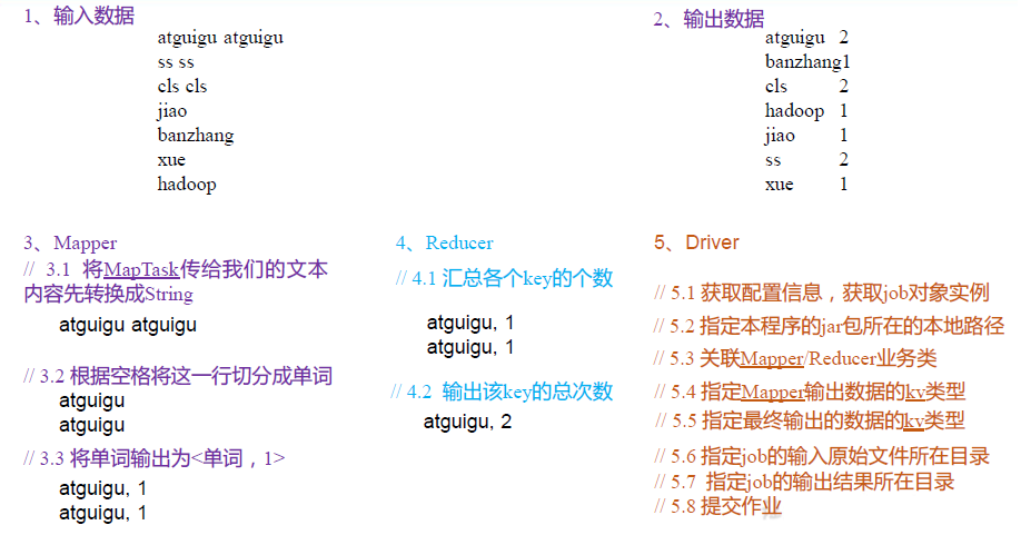 **需求分析:**在给定的文本文件中统计输出每一个单词出现的总次数。按照MapReduce 编程规范,分别编写Mapper,Reducer,Driver。