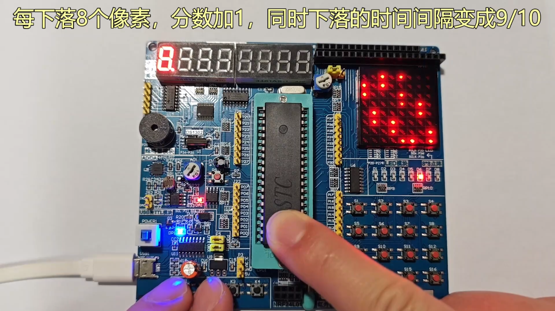 缓存数组的8个字节对应的是8列,对缓存数组的字节进行移位即可实现全屏的LED向下移动一个像素,这样会让玩家控制的点熄灭,但是问题不大,移位之后立刻又点亮玩家控制的那个点的LED即可。
