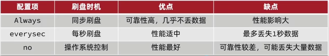 - 如果刚执行完命令 Redis 就宕机会导致对应的修改丢失;