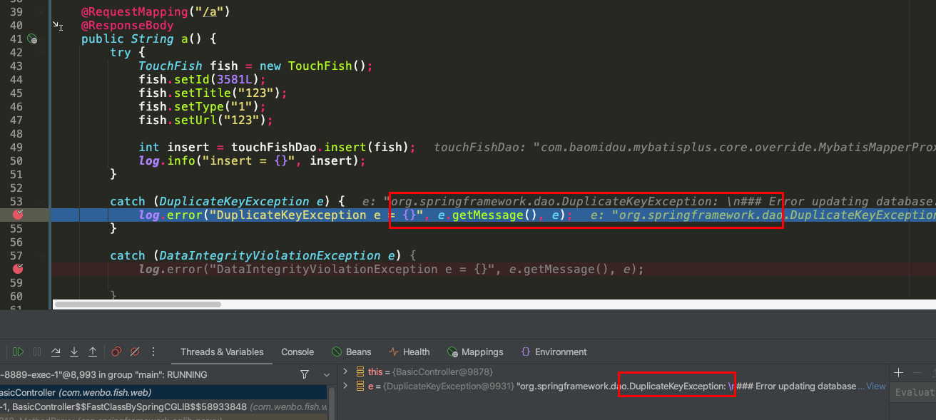 甚至我将B机器重启,如果主键冲突,则抛出DuplicateKeyException异常,进入第7行的逻辑