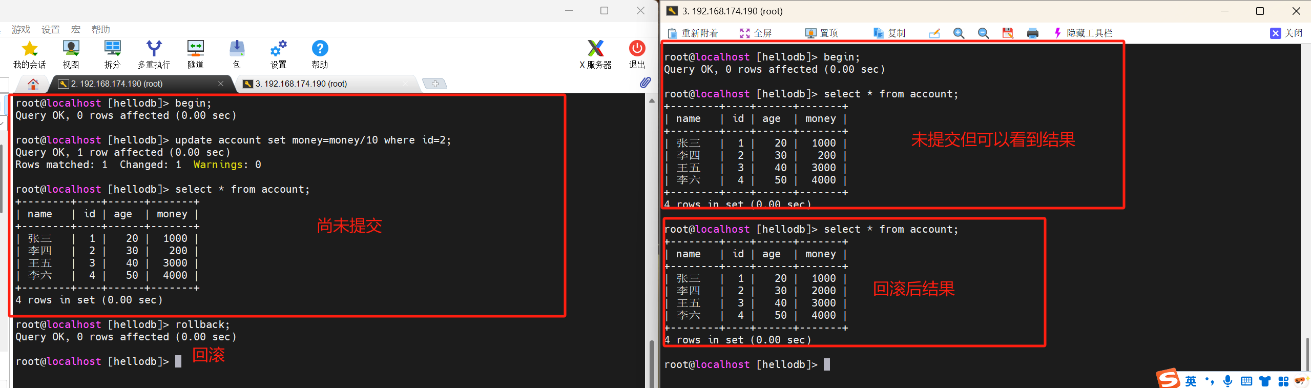 如果没有开启自动提交,那么当前会话连接的mysql所有操作都会在你输入rollback(回滚)或者commit(提交事务)时,才算事务结束。当前事务结束前新的mysql连接时无法读取到任何会话的操作结果。