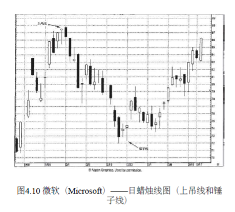 在下跌行情之后出现的伞形线是看涨信号,称为锤子线。在图4.4所示的两种蜡烛线中,无论哪一种,如果出现在上冲行情之后,那么,它就表明之前的市场运动也许已经结束