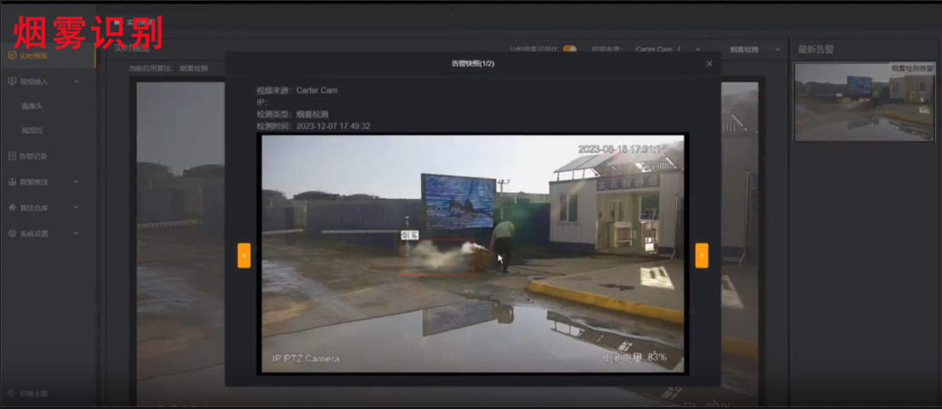- 烟雾检测算法 :识别烟雾的灰白色、半透明、动态扩散形态,输出报警信息。