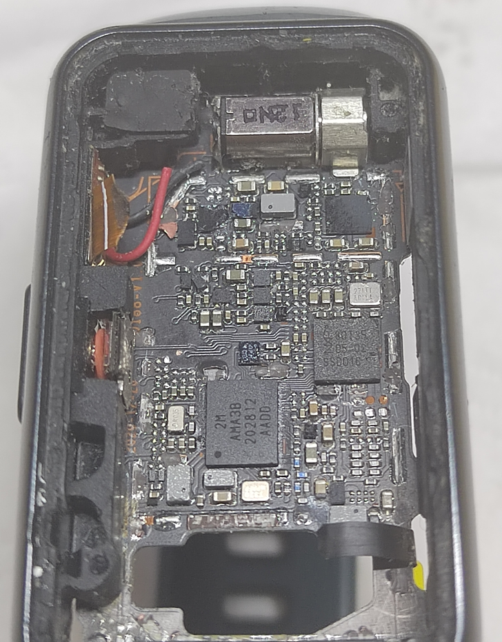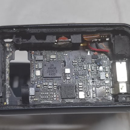 剪断电池就能看到PCB板了,右侧应该是一个震动马达,中间有可见两个芯片,一个上面标有2M AMA38 202812 AADD,猜测AMA38是芯片型号,但是没有找到对应的芯片资料。