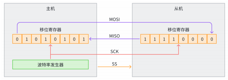 SPI 通信中,主机和从机都有一个串行移位寄存器。主机通过向自己的 SPI 串行寄存器写入一个字节来发起传输。