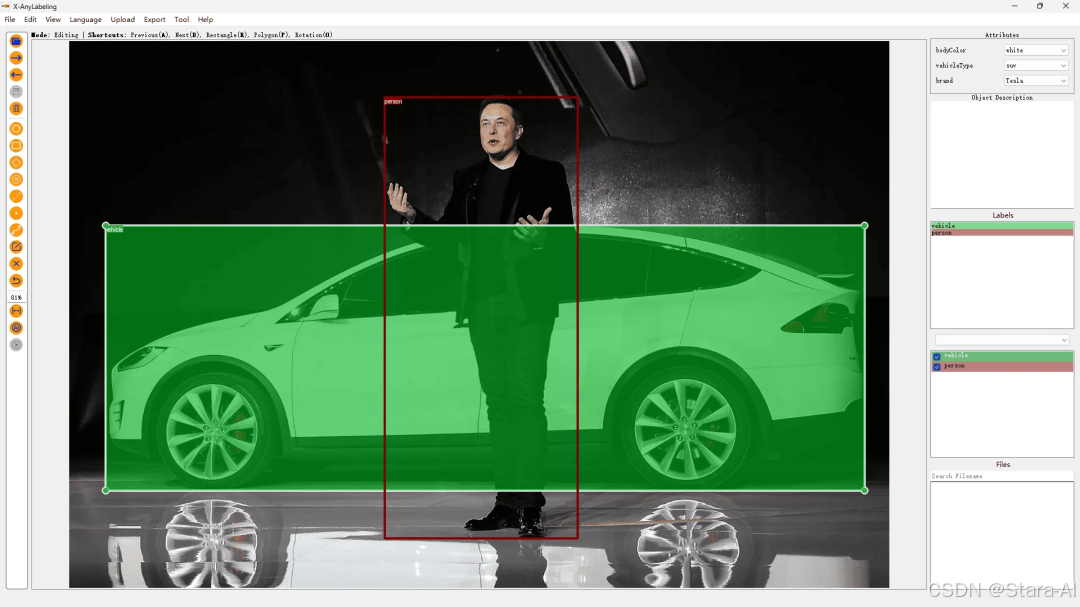 目前,X-AnyLabeling 中适配了 PaddlePaddle 开源的 PULC 车辆属性(Vehicle Attribute)和行人属性(Person Attribute)模型。整体的用户界面(UI)设计也参照 CVAT 的标注范式,为用户提供更加一致和友好的体验。