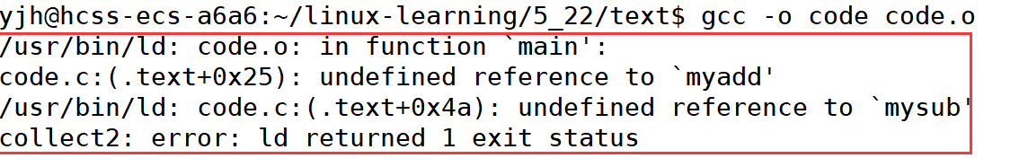 这里由于我们链接的是第三方库libmyc.a且没有指明库的名称和路径,导致code.c中调用的库方法无法被gcc编译器识别报出方法未定义之类的错误。