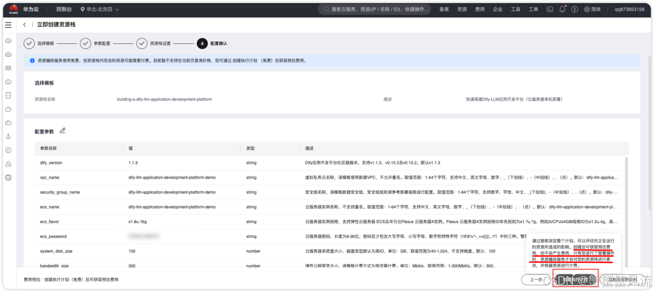 在"选择模版 "界面中,单击"下一步",进入到"参数配置"页面。这个页面要完成自定义参数的填写。你可以参考列表提供的描述进行自定义填写。需要重点注意的是"云服务器密码 "以及看清楚云服务器的计费模式,默认的计费模式是按需计费。