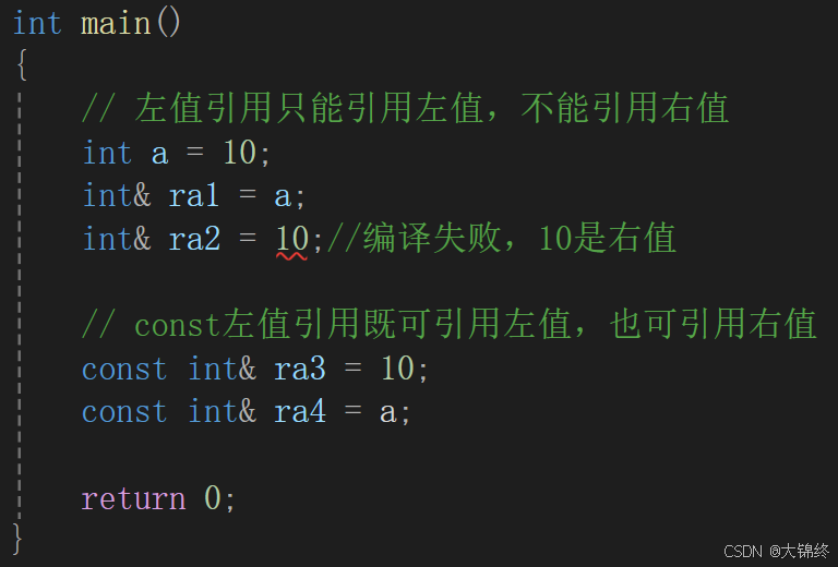 - 左值引用只能引用左值,不能引用右值。