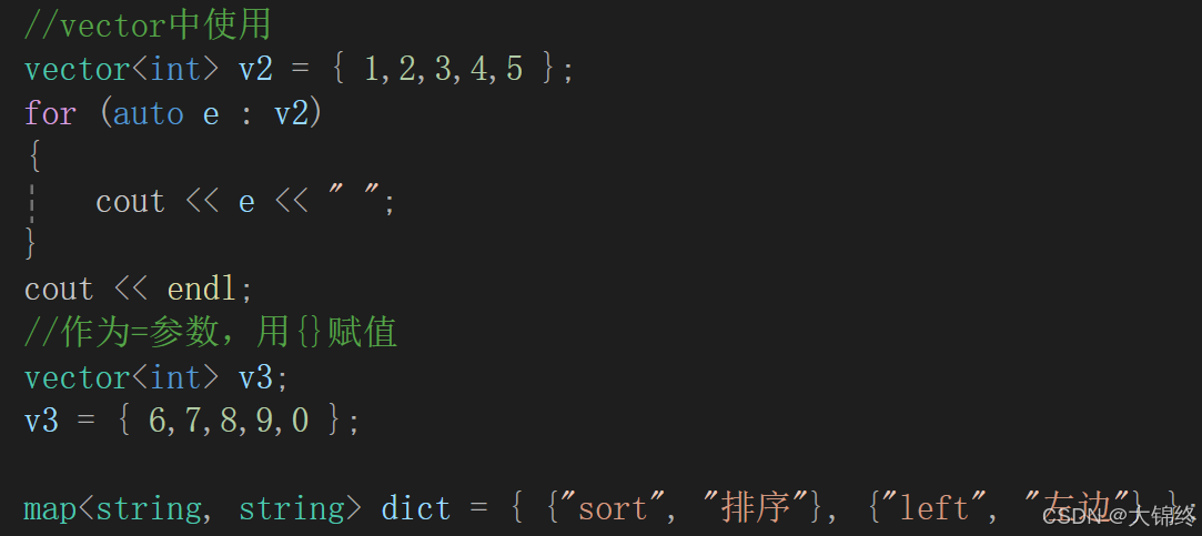 std::initializer_list作为参数的构造函数,这样初始化容器对象就更方便了。也可以作为operator=的参数,这样就可以用大括号赋值