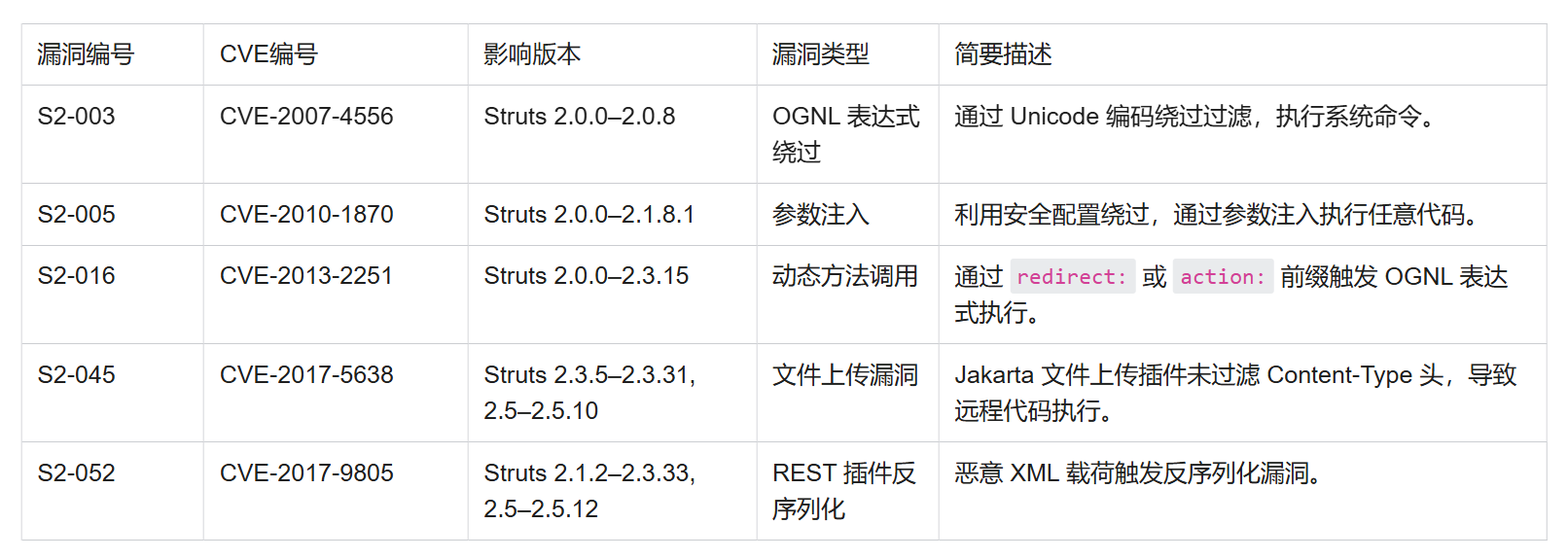 - [Struts2 历史漏洞汇总(表格)](#Struts2 历史漏洞汇总(表格))