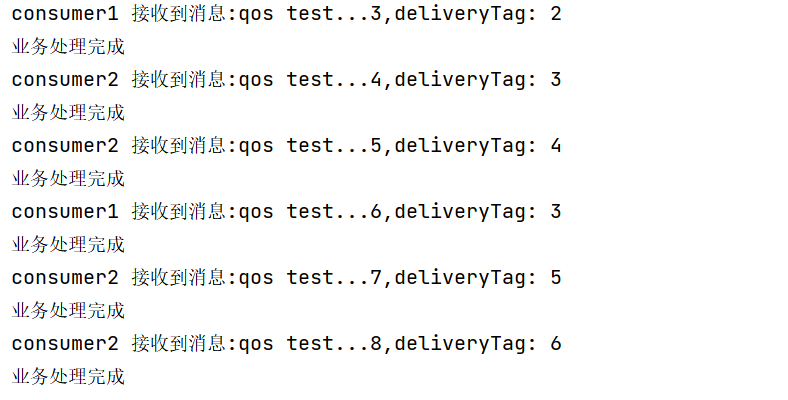 java@Component public class QosListener { @RabbitListener(queues = Constants.QOS_QUEUE) public void messageHandler1(Message message, Channel channel) throws IOException { long deliveryTag = message.getMessageProperties().getDeliveryTag(); try{ System.out.printf("consumer1 接收到消息:%s,deliveryTag: %d \n",new String(message.getBody(),"UTF-8"),message.getMessageProperties().getDeliveryTag()); //业务逻辑处理 Thread.sleep(2000); System.out.println("业务处理完成"); //消息正常消费,肯定确认 channel.basicAck(deliveryTag,false); }catch (Exception e){ //消息消费异常,否定确认 channel.basicNack(deliveryTag,false,true);//单条否定,重新发送消息 } } @RabbitListener(queues = Constants.QOS_QUEUE) public void messageHandler2(Message message, Channel channel) throws IOException { long deliveryTag = message.getMessageProperties().getDeliveryTag(); try{ System.out.printf("consumer2 接收到消息:%s,deliveryTag: %d \n",new String(message.getBody(),"UTF-8"),message.getMessageProperties().getDeliveryTag()); //业务逻辑处理 Thread.sleep(1000); System.out.println("业务处理完成"); //消息正常消费,肯定确认 channel.basicAck(deliveryTag,false); }catch (Exception e){ //消息消费异常,否定确认 channel.basicNack(deliveryTag,false,true);//单条否定,重新发送消息 } } }