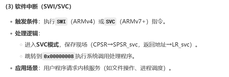 svc模式,主要用于完成系统初始化的工作,cpu上电之后默认的工作模式,当调用swi/svc,cpu处于svc模式;