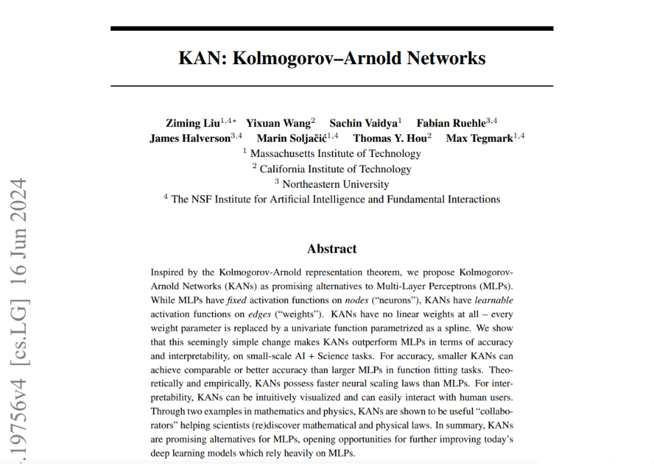 Kolmogorov-Arnold网络(KAN)是多层感知器Q(MLP)的有前途的替代品。KAN 与 MLP 一样具有强大的数学基础:MLP 基于通用近似定理,而KAN基于Kolmogorov-Arnold表示定理。KAN和MLP是双重的:KAN在边缘上具有激活函数,而MLP在节点上具有激活函数。多层感知器(MLP)与 Kolmogorov-Arnold 网络(KAN)的比较如下图(摘自论文):