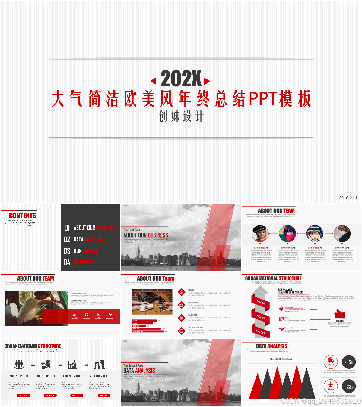 第四套PPT模版是欧美风年报,竖条纹背景,红黑数据看板,团队介绍。适用于上市公司年报。