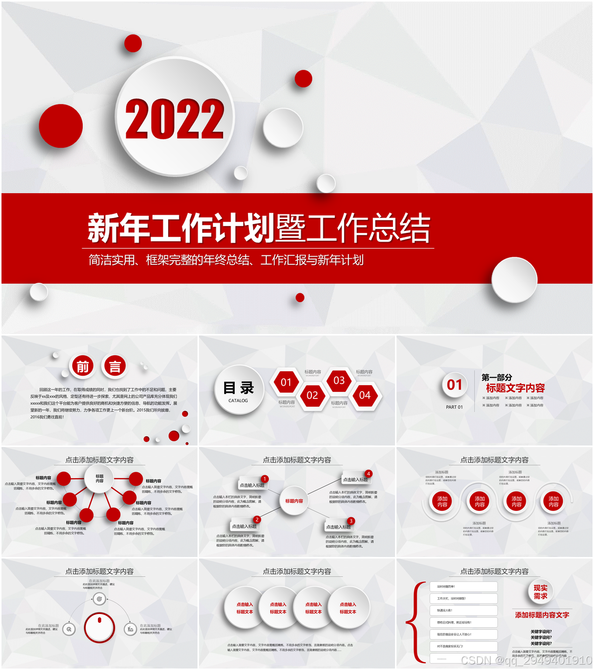 第三套PPT模版是灰白多边形背景,红色圆形元素,目录、流程图等。适用于年终总结。