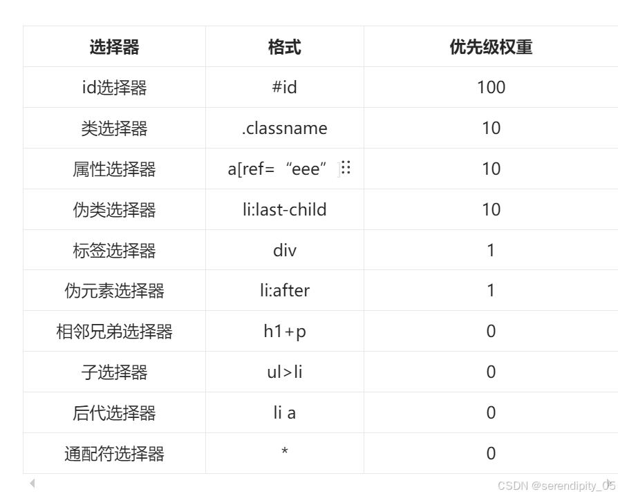 - 通用选择器(*)、子选择器(>)和相邻同胞选择器(+)并不在这四个等级中,所以它们的权值都为 0 ;