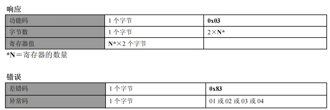 从站地址 | 0x03 | 数据字节数 | 寄存器值(每寄存器2字节) | CRC -