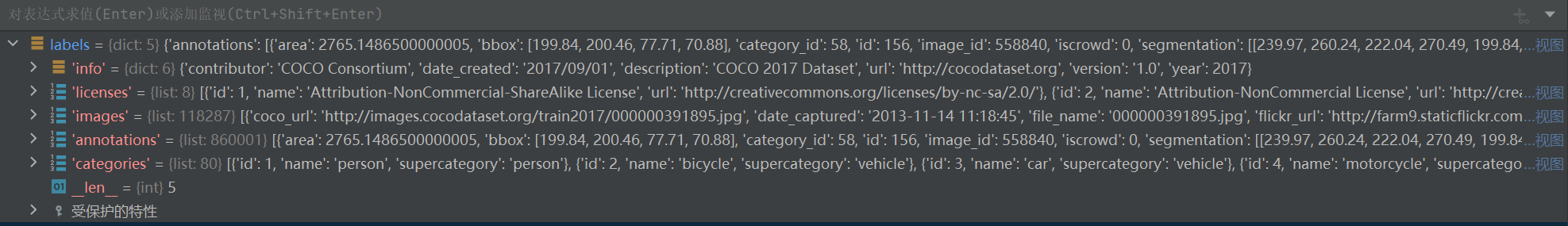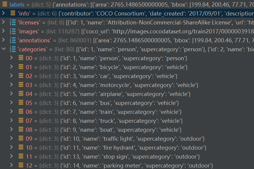 其中:labels中有5个字典:分别是info、licenses、Images、 annotations、categories。