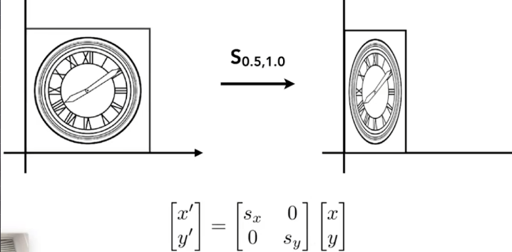 \[\mathbf{S}(s_x, s_y) = \begin{pmatrix} s_x & 0 & 0 \\ 0 & s_y & 0 \\ 0 & 0 & 1 \end{pmatrix} \]