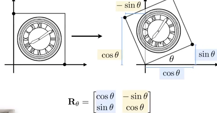\(\mathbf{R}(\alpha) = \begin{pmatrix}\cos \alpha & -\sin \alpha \\\sin \alpha & \cos \alpha \\\end{pmatrix}\) \(\mathbf{R}(-\alpha) = \begin{pmatrix}\cos \alpha & \sin \alpha \\-\sin \alpha & \cos \alpha \\\end{pmatrix} ={R_\alpha}^T={R_\alpha}^{-1}\)