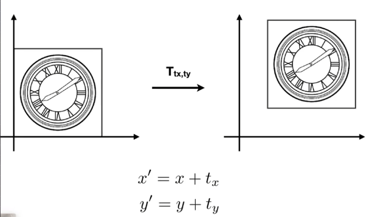 \[\begin{bmatrix} x' \\ y' \\ w' \end{bmatrix} = \begin{bmatrix} 1 & 0 & t_x \\ 0 & 1 & t_y \\ 0 & 0 & 1 \end{bmatrix} \cdot \begin{bmatrix} x \\ y \\ 1 \end{bmatrix} = \begin{bmatrix} x + t_x \\ y + t_y \\ 1 \end{bmatrix} \]