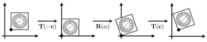 我们前面只知道怎么沿着原点旋转,如果要沿着其他的一个点旋转一个图形,我们就可以先平移到原点,然后进行旋转,最后我们旋转完之后再平移回去是一样的。