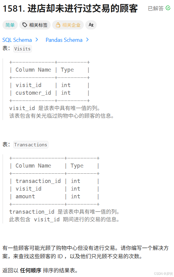 题目:1581. 进店却未进行过交易的顾客