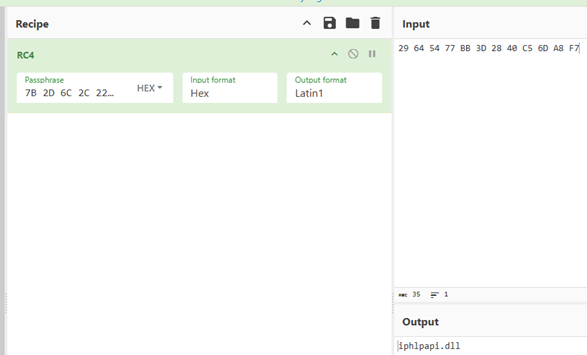 RustyStealer的字符串和配置文件均使用RC4进行解密。如果传参时没有指定RC4密钥,则使用长度16字节的默认密钥"7B 2D 6C 2C 22 20 2B 72 33 2F 23 7E 26 3B 76 5F"进行解密。