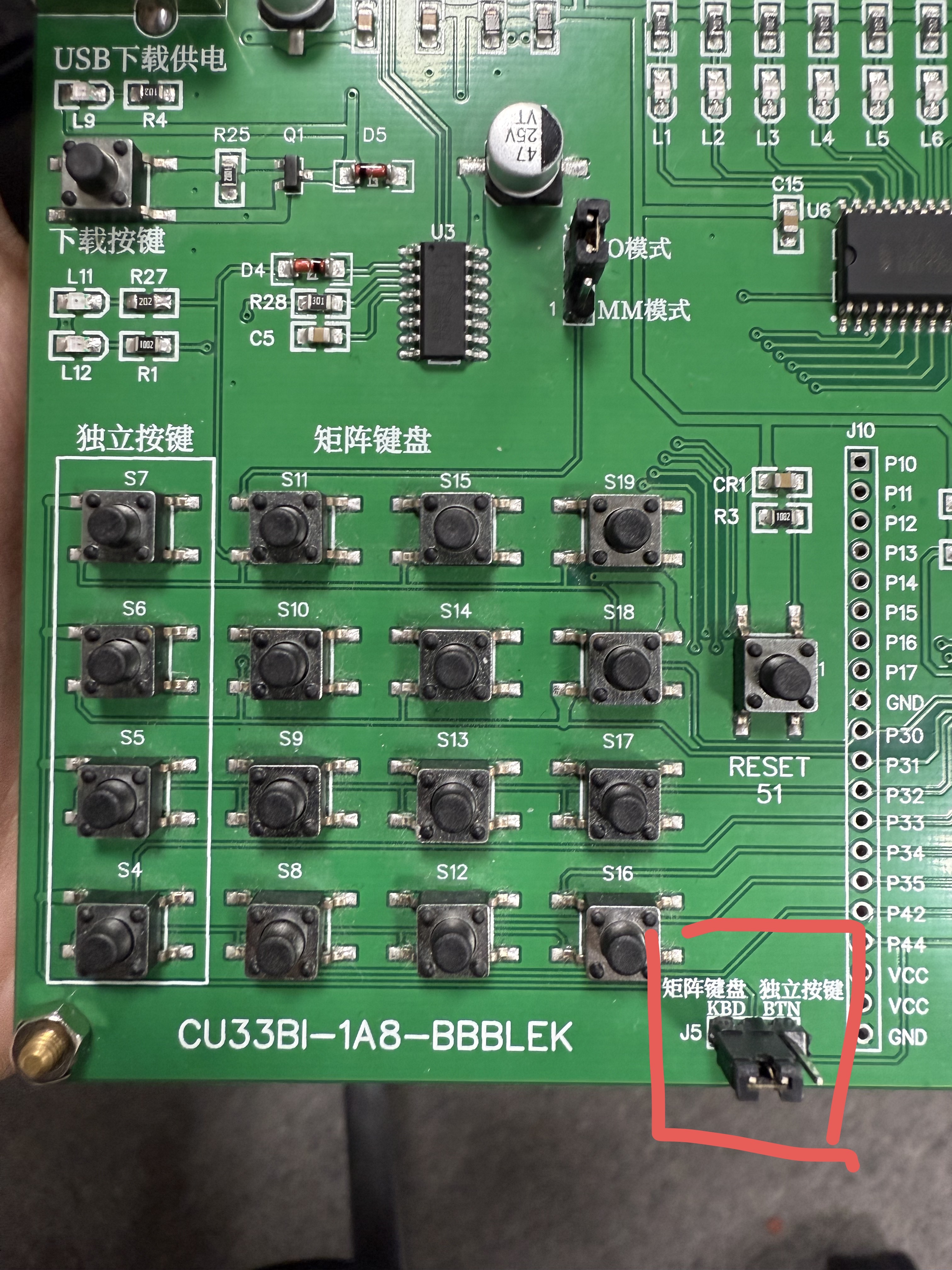 这是板子上按键的原理图,如果要切换独立按键和矩阵键盘,那么我们需要将板子上J5部分的小插口的东西插到对应的位置上去,本项目是在KBD上,12是KBD矩阵键盘,23是BTN独立按键,如下图: