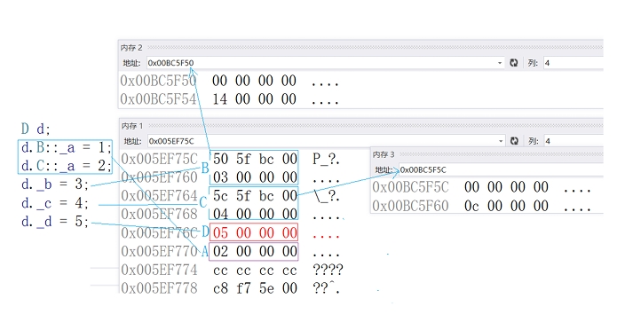下图是内存中存储的d对象模型(未进行虚拟继承处理的):