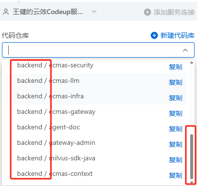 而我自己创建的服务连接,其Codeup服务连接对codeup代码仓库的可见权限继承自Codeup(有点绕),仅限于backend组,即后端组Java开发(然后老板还给我指派运维工作。。。)
