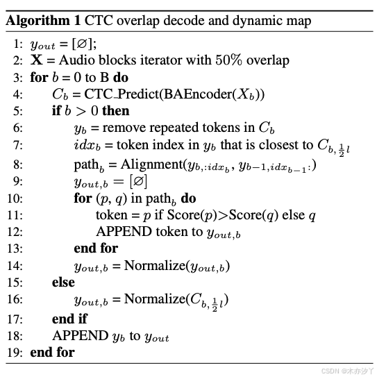 在本文中,我们像 [24] 中的动态映射技巧一起应用了重叠的推断,以恢复边界处的错误输出,如算法1所示。 在推理期间,我们使用 50% 分割输入音频时重叠,这可以确保由编码器和CTC预测输入音频的任何框架。 通过定位符元索引在 最接近于中心点的位置,