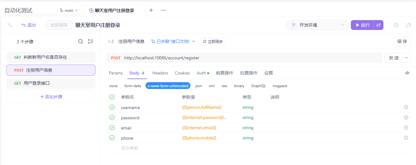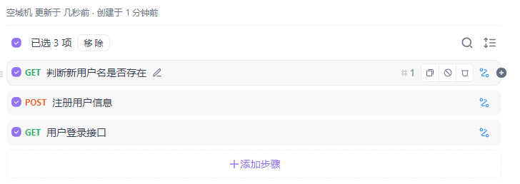 - 首先添加步骤,可以从接口导入,这里选择了和用户有关的三个接口,分别是判断新用户吗是否存在、注册用户信息、用户登录接口