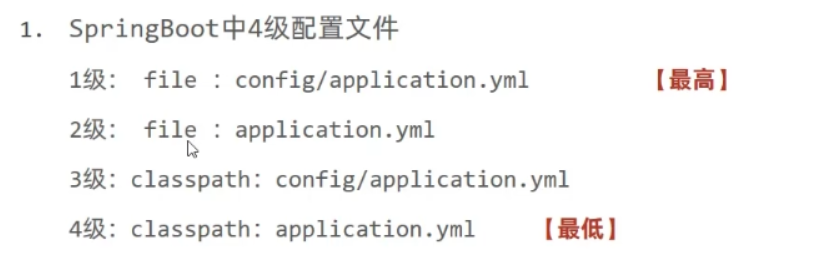 应用classpath目录的配置文件 < 应用classpath目录下config目录的配置文件 < jar包所在目录的配置文件 < jar包所在目录的同级config目录下的配置文件 < 操作系统环境变量 < 命令行参数