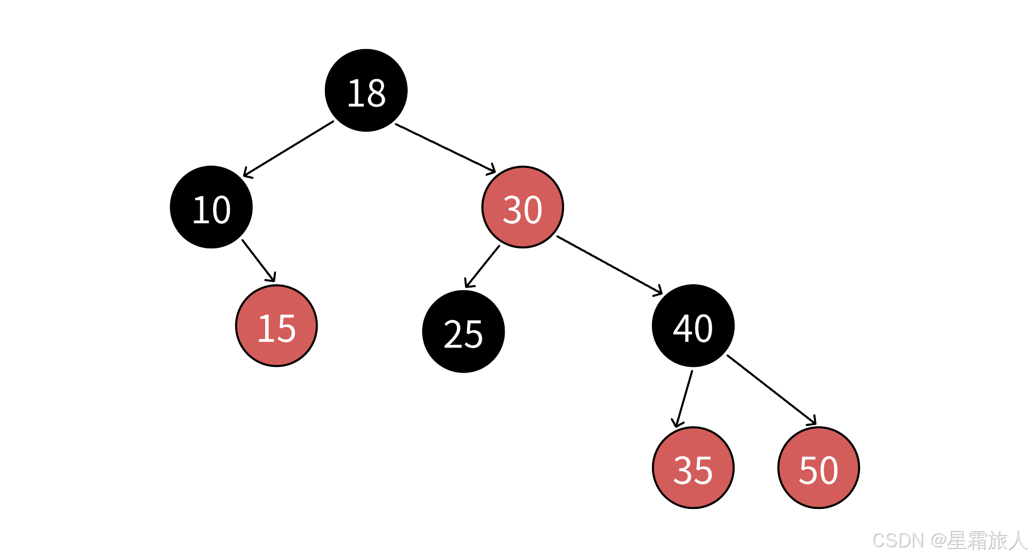 - 规则4:在前序遍历中,使用形参记录从根节点到当前节点的黑色节点数量。遍历过程中,遇到黑色节点就增加黑色节点数量,遍历到空节点即可计算出一条路径的黑色节点数量。将任意一条路径的黑色节点数量作为参考值,依次比较即可。