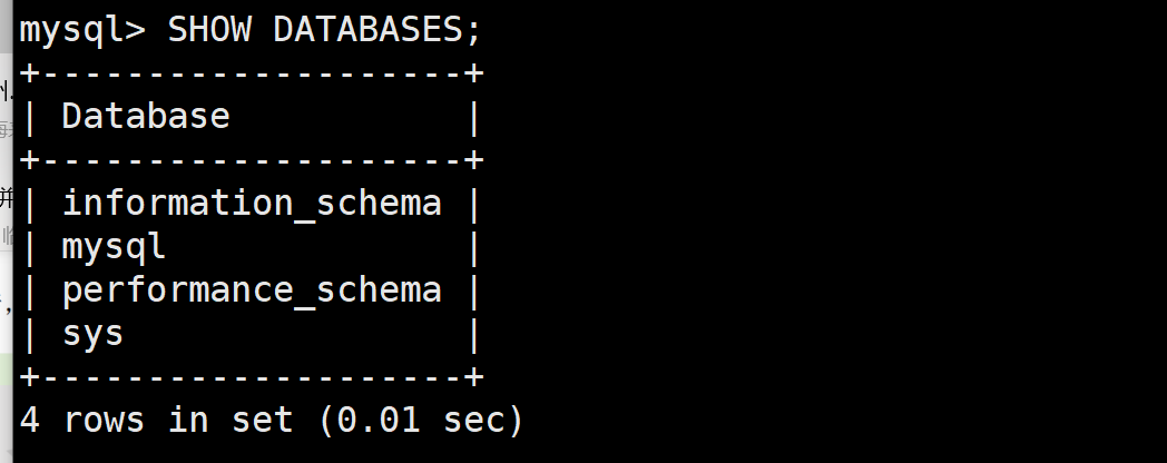例如,以用户名 root 登录到"mysql>"环境后,执行"SHOW DATABASES"语句可以查 看当前数据库中有哪些库。