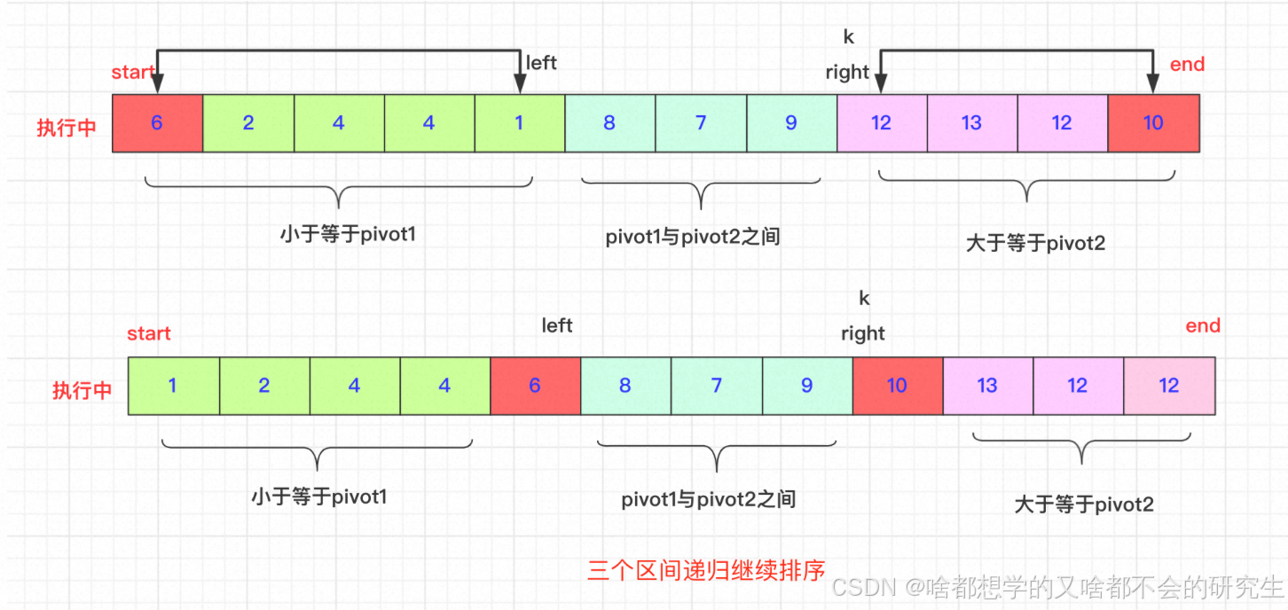 选取待排序的最左侧、最右侧的两个数作为轴pivot1、pivot2,并且保证pivot1< pivot2,不满足就交换。通过交换数组中的元素,小于pivot1的元素放在pivot1左侧,大于pivot2的元素放在最右侧,在两者之间的放在中间。