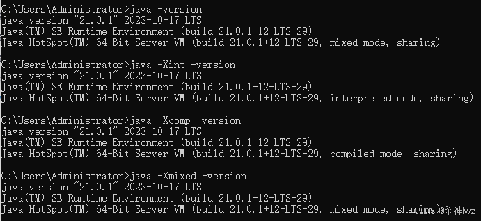 缺省情况下HotSpot VM是采用解释器与即时编译器并存的架构,当然开发人员可以根据具体的应用场景,通过命令显式地为Java虚拟机指定在运行时到底是完全采用解释器执行,还是完全采用即时编译器执行。如下所示: