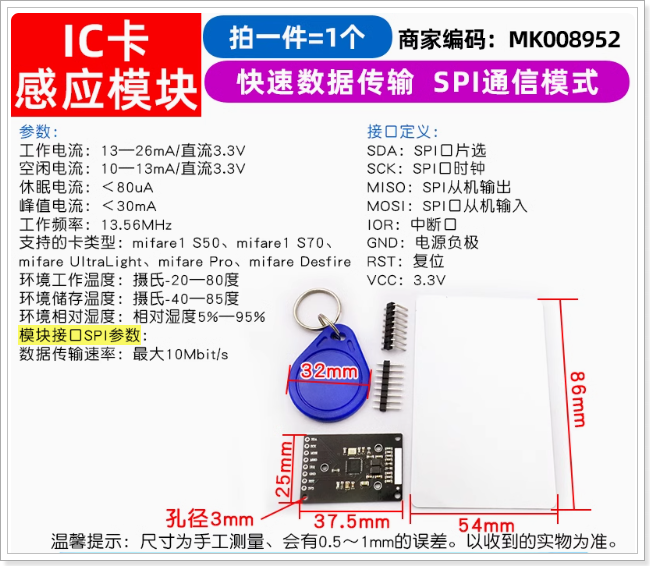 本次使用的RFID模块采用的驱动IC型号是MFRC522,对于该芯片支持多种通信接口,比如支持UART、SPI、IIC.....,本次使用SPI接口进行通信。